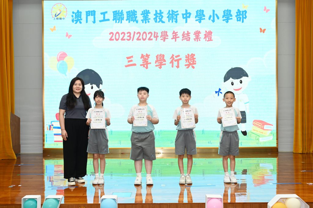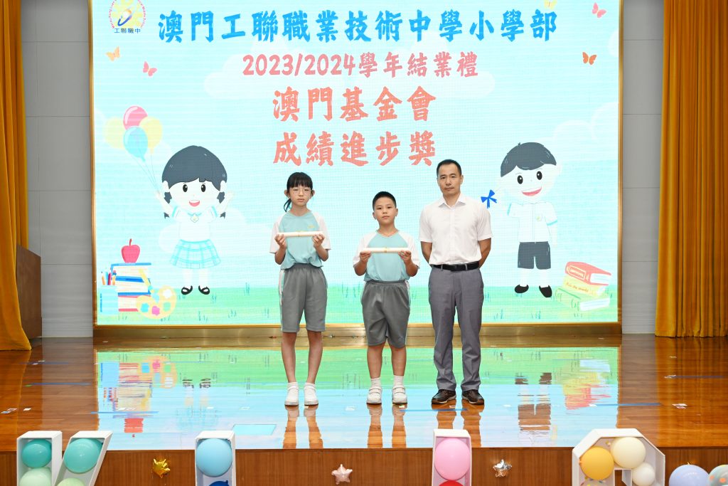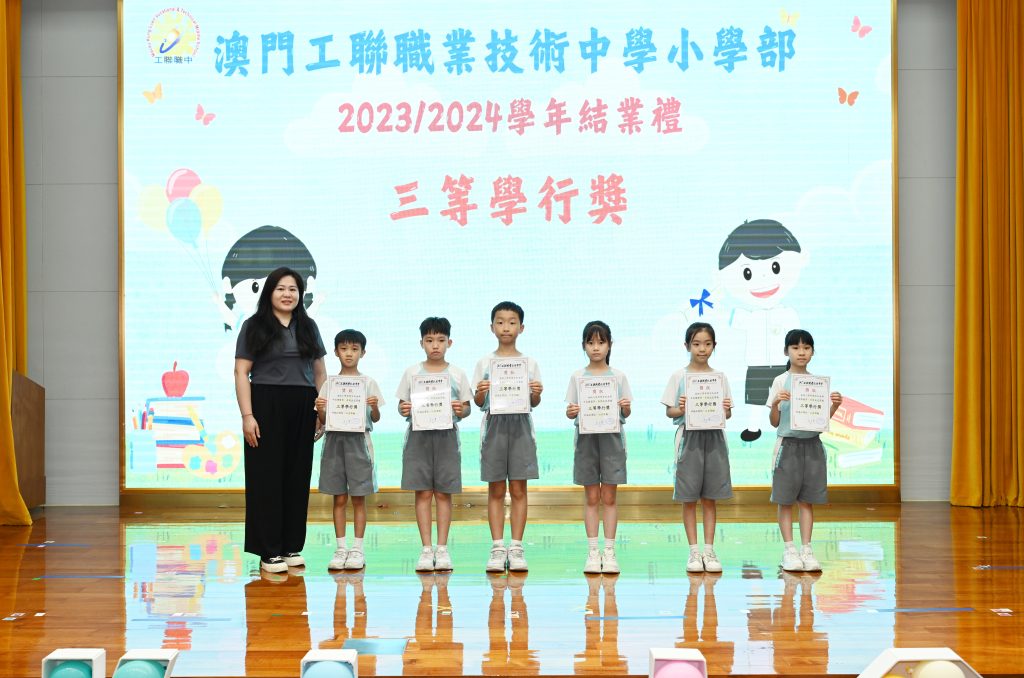 澳門工聯職業技術中學小學部2023/2024學年結業禮於2024年7月13日上午9時於本校禮堂舉行,是次結業禮亦誠邀了家長們一起參與見證,結業禮先由呂吉實進行致辭,呂校長先向各位來賓講述了本校中學部應屆畢業生的升學情況,表示未來會與更多企業合作,提供更多實習機會給學生,同時亦會積極推動學生參與更多的考證、比賽、實踐活動,讓學生學以致用,呂校長在致辭中亦表示十分高興行是次結業禮能順利舉行,喜見小學部師生們人才濟濟,同時祝福同學在來年學業進步,勉勵同學們勤奮努力、孝順父母,期待在新學年看到更好的大家。隨後於結業禮上進行了各獎項的頒奬儀式,奬項包括:「澳門基金會奬」、「中國銀行奬」、「學行一等奬」、「學行二等奬」、「學行三等奬」和「環保校園加FUN奬」以及校內比賽獎項,包括:數學比賽和常識發明品等獎項。在頒奬儀式結束後,作為感謝老師們在這一年學年來的教導,以及同儕之間的友誼,小學部各班亦精心準備了表演節目供大家欣賞,相信同學們與家長們都在是次結業禮中都感受到校園生活的快樂和辛勤學習的作果。最後,典禮於老師們、同學們以及來賓們的歡樂笑聲中完滿結束。