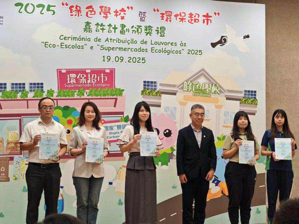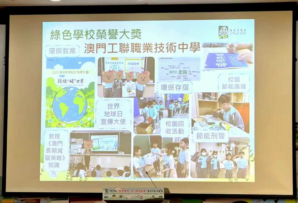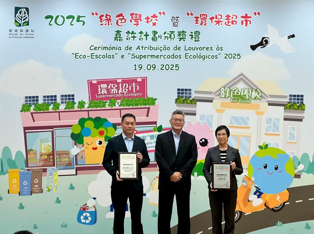 由澳門環境保護局主辦的2025年“綠色校園嘉許計劃”頒獎典禮於2025年9月19日舉行,表揚本地學校在推動環保教育及實踐方面的卓越表現。熱烈祝賀本校小學部曾翠欣老師、譚海彤老師、黃敏婷老師及尹淑賢老師為校奪得 “綠色學校榮譽大獎”殊榮;同時,以上老師皆獲得本年度“環保教案設計獎勵計劃”優秀獎及帶領學生獲得“環保校園嘉FUN獎”!