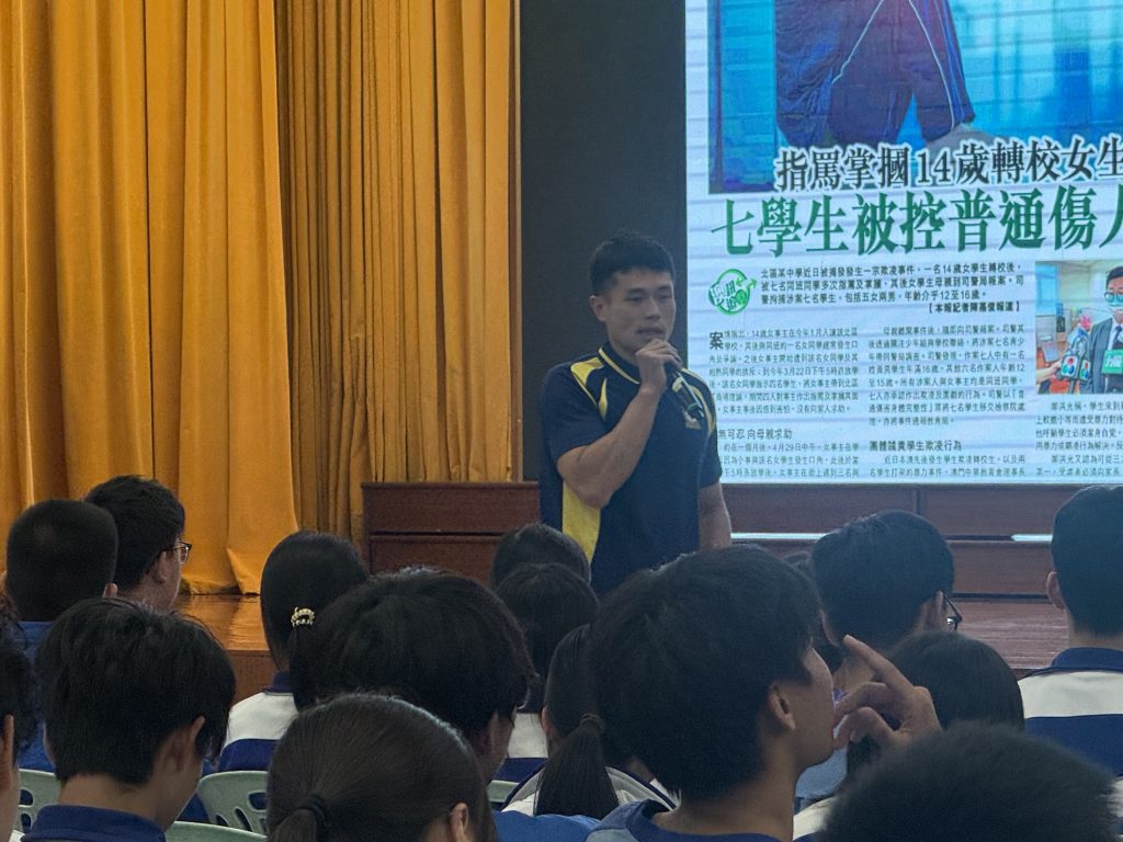 為加強青少年的法治觀念,提升學生對傷人及欺凌行為的認知與防範意識。本校於10月24日邀請司法警察局的警務人員到校,為初高中學生舉辦以「預防傷人與欺凌犯罪」為主題的周會。