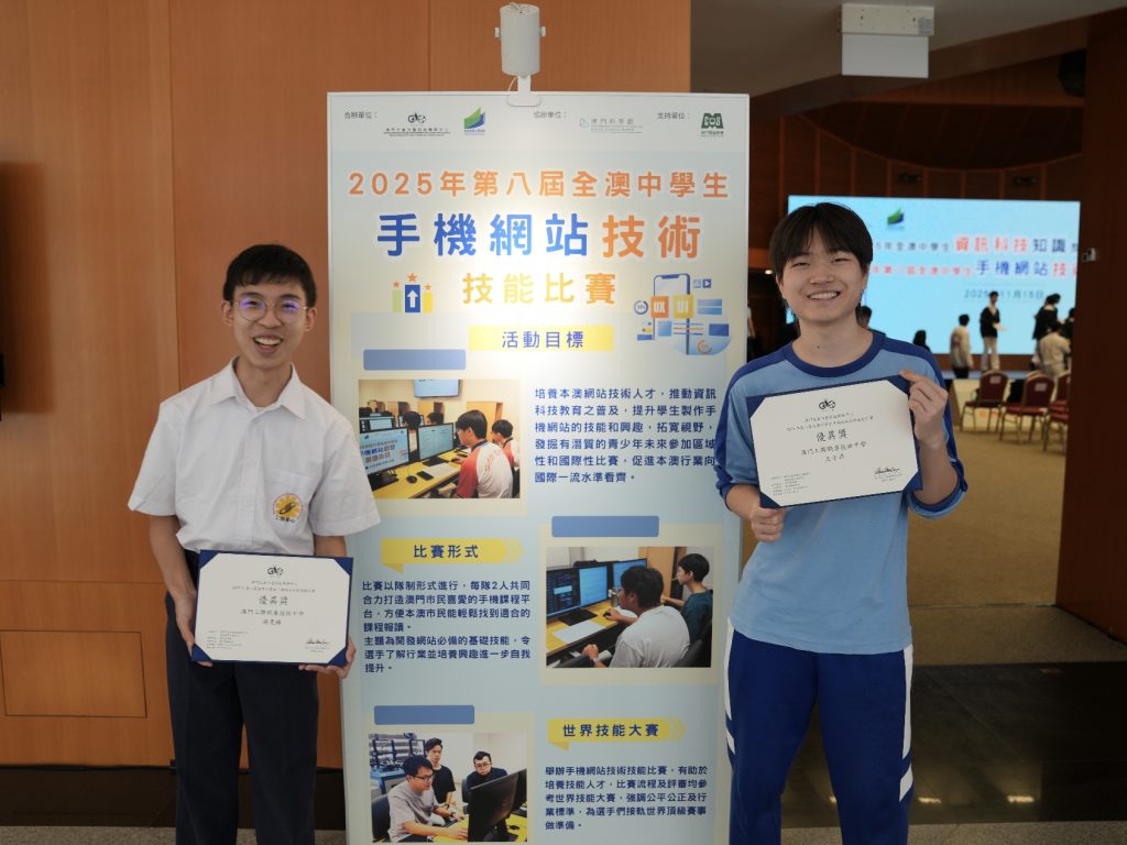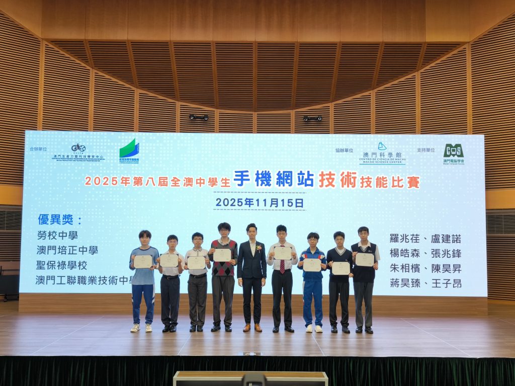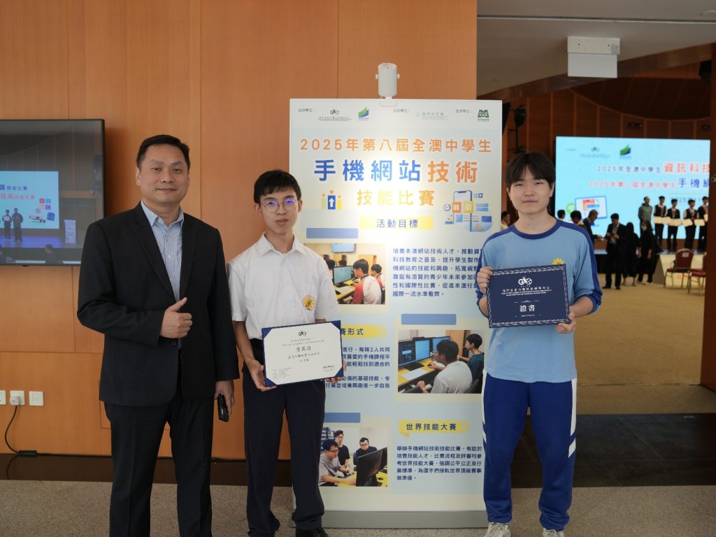 在澳門生產力暨科技轉移中心主辦的「第八屆全澳中學生手機網站技術技能比賽」中,我校高三物聯網班蔣昊臻同學與高三資訊班王子昂同學表現出色,榮獲優異獎。