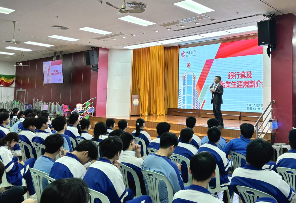 為幫助學生掌握行業最新動態並儘早確立職業目標,我校邀請中國銀行(澳門)的資深人員蒞臨學校,為我校高中的學生,舉辦了一場主題為「銀行業發展與生涯規劃」的專題講座。