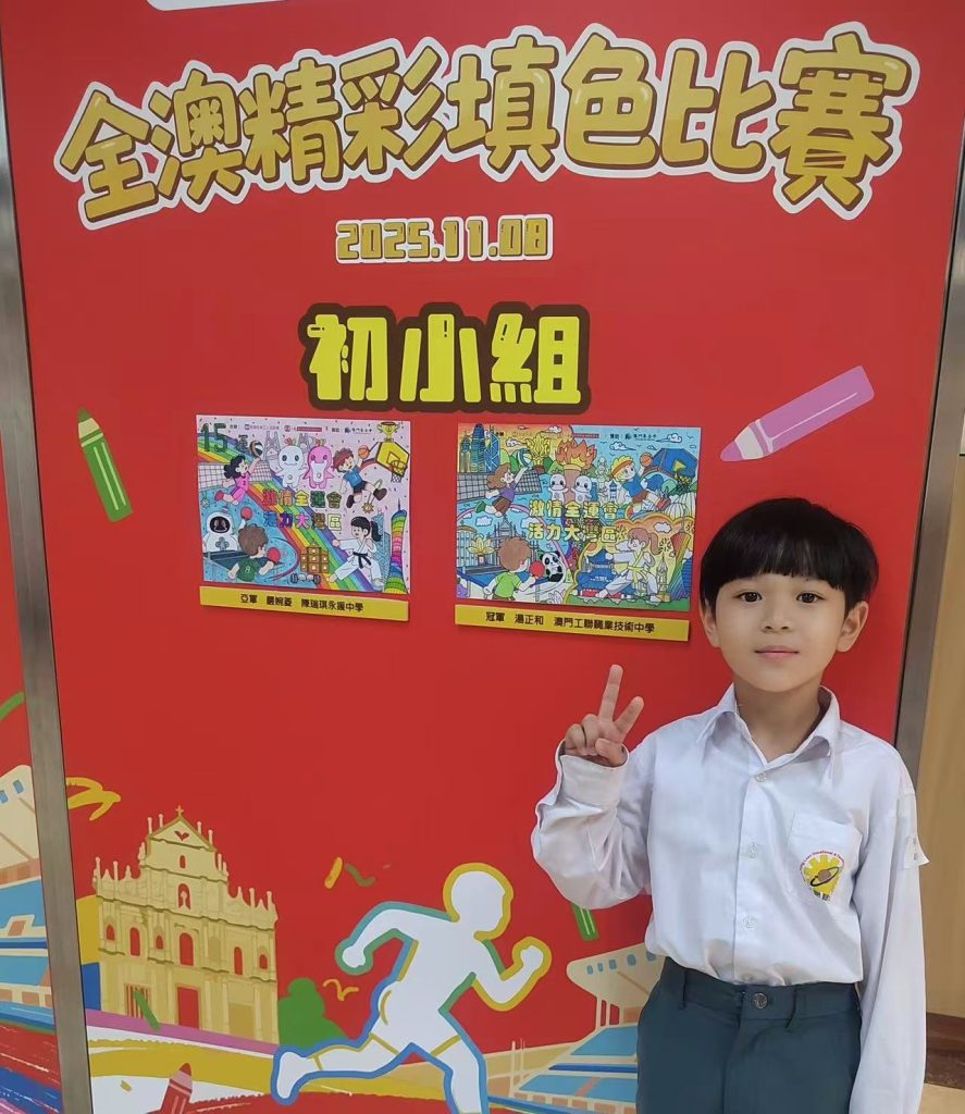 11月8日,澳門工會聯合總會舉辦 “全”澳精彩填色比賽頒獎典禮。我校湯正和同學榮獲初小組冠軍。湯正和同學表示,通過此次活動,他進一步暸解了全運會的運動項目,感受到運動員們的堅持精神,並特別感謝媽媽和老師們對他的悉心指導。