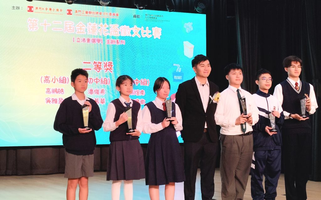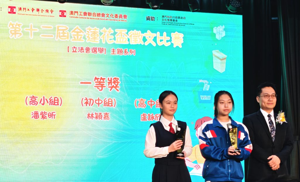 由工聯總會及工聯文化委員會主辦、文化發展基金資助的第十二屆「金蓮花盃」徵文比賽,歷經專業評審團的嚴格評選,近日圓滿落幕。本屆比賽以「澳門立法會選舉」為主題,共吸引全澳29所學校、261名學生踴躍參與,以筆為媒,書寫對社會事務的深刻觀察與時代思考。