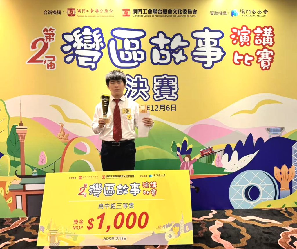 由澳門工會聯合總會及澳門工會聯合總會文化委員會主辦、澳門基金會贊助的第二屆《灣區故事》演講比賽於2025年12月6日圓滿落幕,我校獲獎表現超越去年。