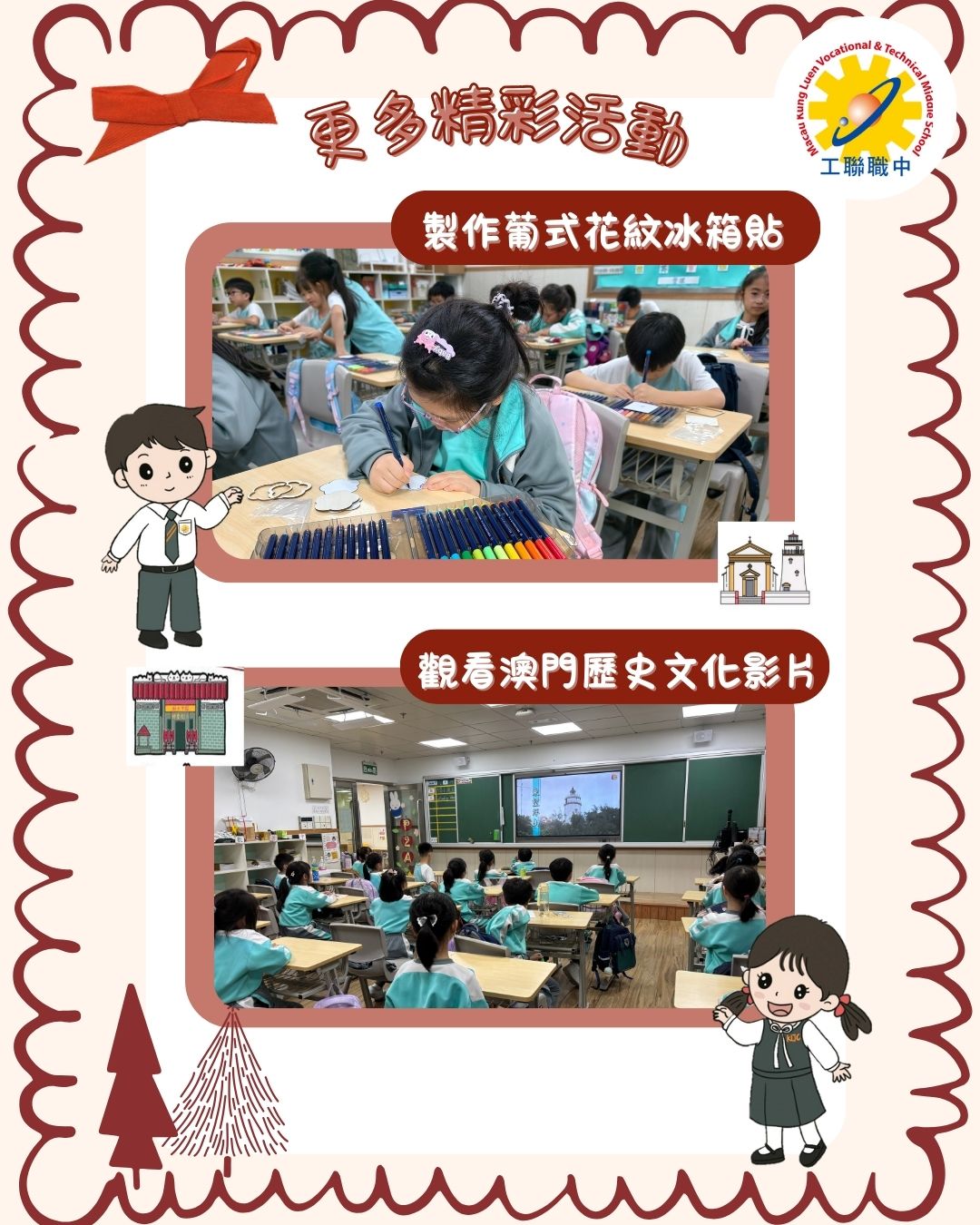 活動尾聲,老師播放與澳門歷史文化相關的影片,藉此加深學生對澳門本土文化的認識。此次活動不僅令學生感受到濃厚的節日氛圍,更深化了學生對澳門歷史文化的認識。
