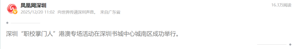 12月19日,由深圳中華職教社與微博校園聯合主辦,深圳市教育局、市人力資源和社會保障局、香港職業訓練局、香港中華職教社協辦的深圳“職校掌門人”港澳專場活動在深圳書城中心城南區成功舉行。作為2025年“職校掌門人”系列活動的收官之作,本次活動特邀香港高等教育科技學院校長劉建德博士與澳門工聯職業技術中學校長呂吉實,分享港澳職業教育的創新實踐與發展經驗,共同探討粵港澳大灣區職業教育協同發展的未來路徑。市政協副主席、深圳中華職教社主任吳以環出席活動。