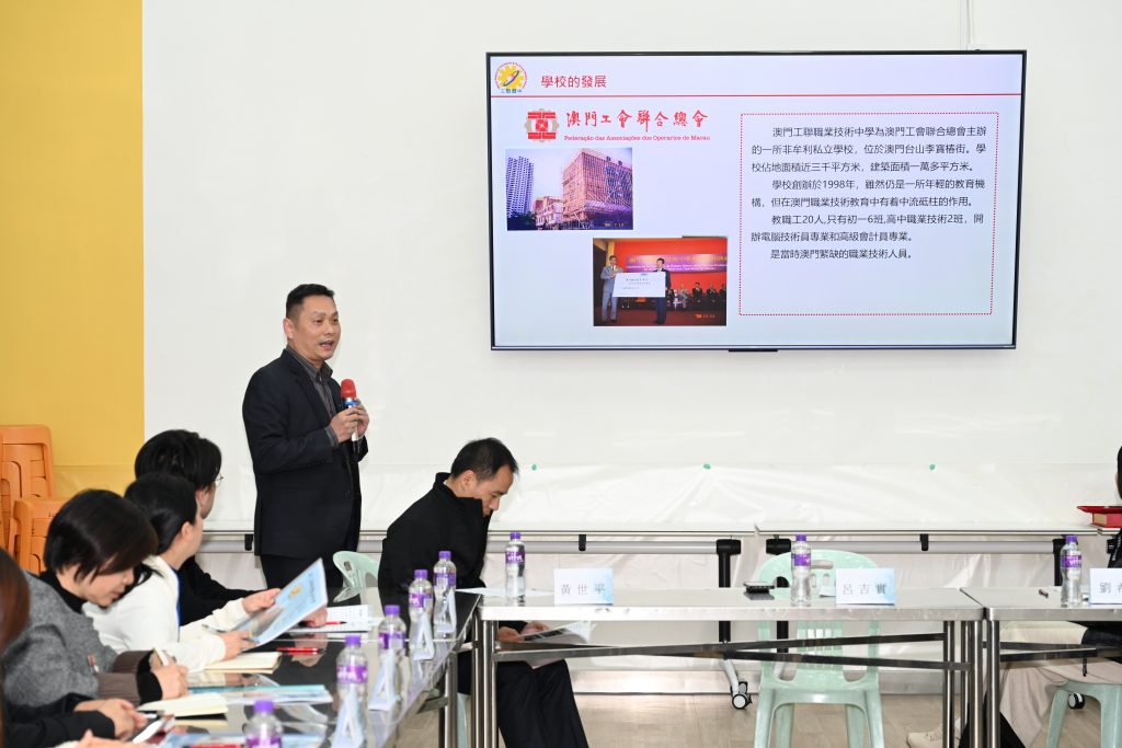 呂吉實校長詳介學校多元課程體系及對接澳門「1+4」經濟適度多元策略的辦學特色,重點分享文化基礎與專業技能雙培養模式。學員們參觀特色專業教室與實訓基地,觀摩技能教學課堂,並與校方圍繞職教課程設計、校企合作、學生素養培育等議題深入研討。