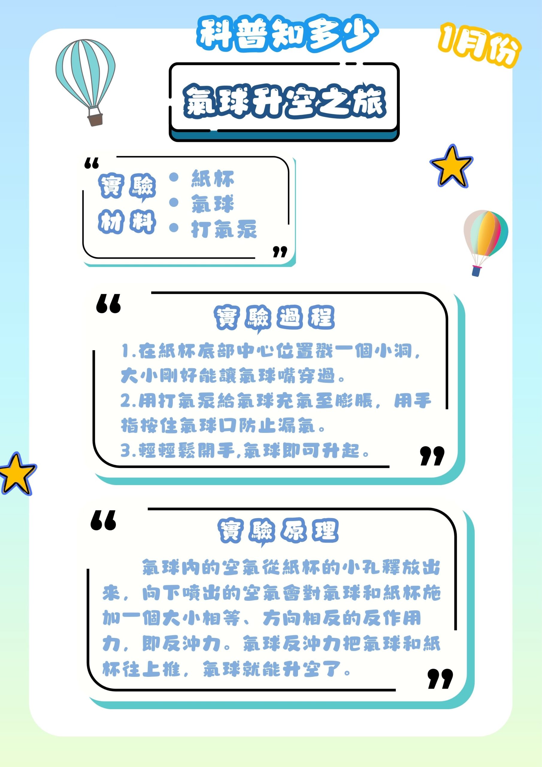 為培養學生的科學素養,讓學生主動探索科學的奧秘,本校小學部一月份「科普知多少」攤位活動如期開展。本次主題為「氣球升空之旅」,面向小一至小三學生,透過生活化材料引導探索,揭開趣味的科學實驗。