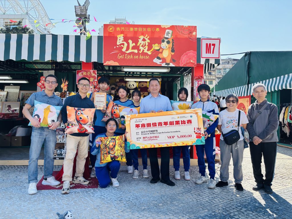 由澳門特別行政區政府經濟及科技發展局與青年創業智庫協會合辦的「2026年宵攤位青年創業比賽」於2026年2月13日下午在塔石廣場舉行現場評選及頒獎典禮 。我校憑藉出色的團隊合作與極具創意的營商計劃,在參賽隊伍中脫穎而出,榮獲「最佳中學團體獎」。