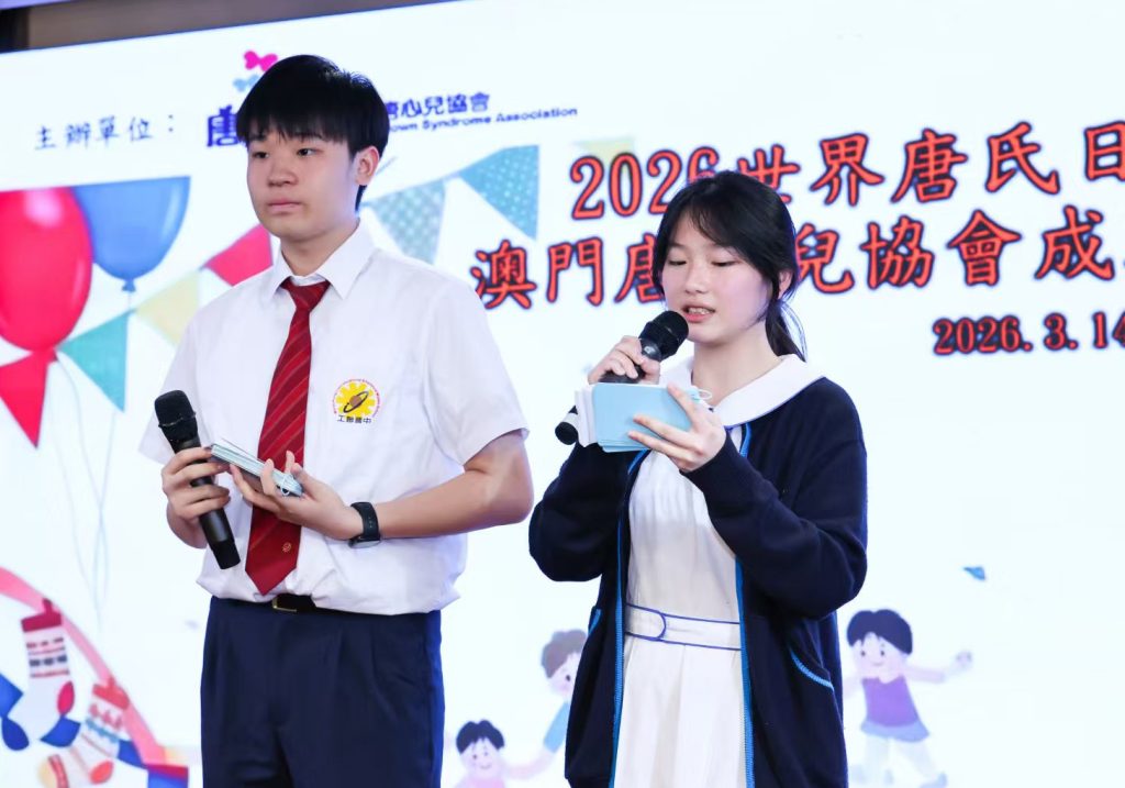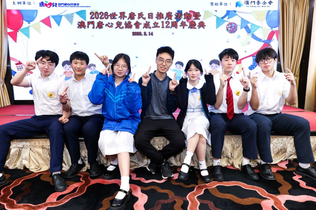 為響應3月21日「世界唐氏日」,並慶祝澳門唐心兒協會成立12週年,本校司儀小組同學與輔導老師一行共七人,於3月14日假座萬豪軒出席了「2026世界唐氏日推廣活動暨澳門唐心兒協會成立12周年慶典」。