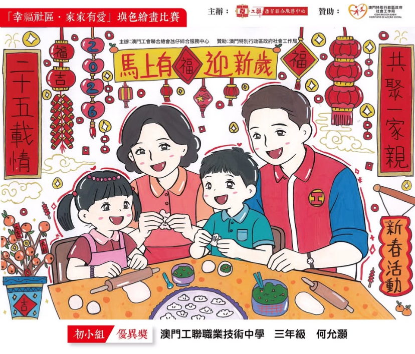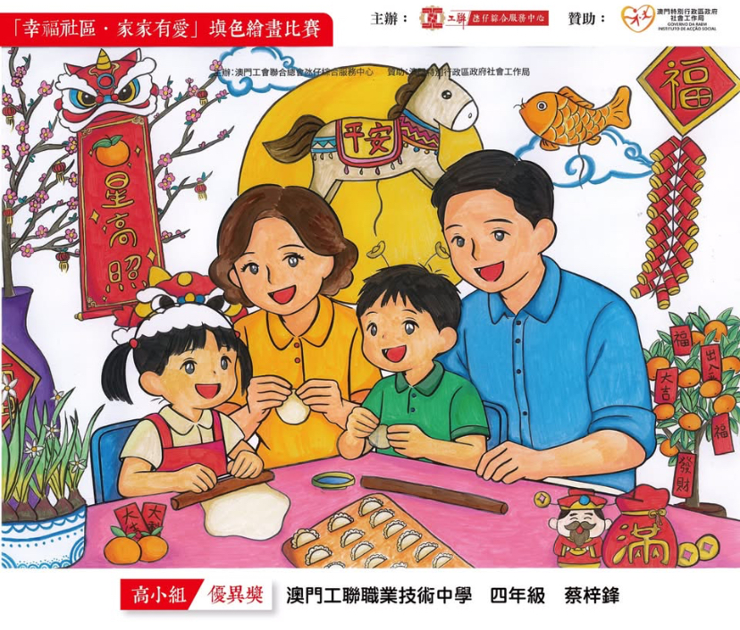 由澳門工會聯合總會主辦「幸福社區‧家家有愛」填色繪畫比賽,恭喜本校兩位同學獲獎!作品充滿創意又溫馨。