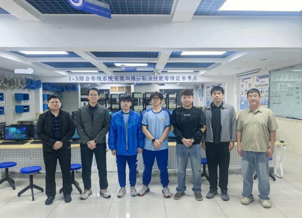 為了對標國際最先進的技術標準,黃嘉杰與梁俊昊自2024年起便投入了漫長的備賽歷程。在學校統籌下,兩位同學前往珠海市理工職業技術學校(工聯職中姐妹學校)的「智慧物聯實訓中心」進行專項集訓。該校為國家級重點中職學校,擁有符合國際賽事標準的先進場地與設備。在集訓期間,學生們接受了由國家集訓基地教練團隊提供的專業指導。教練團參照世界技能大賽的嚴苛標準,針對光纖電纜與銅纜安裝、故障排查、性能測試等核心技能,為他們量身定制了系統化訓練方案。這場「以賽促訓」的深度交流,不僅提升了學生的競技實力,更是珠澳職業教育「人才聯動」與融合發展的鮮活實踐。
