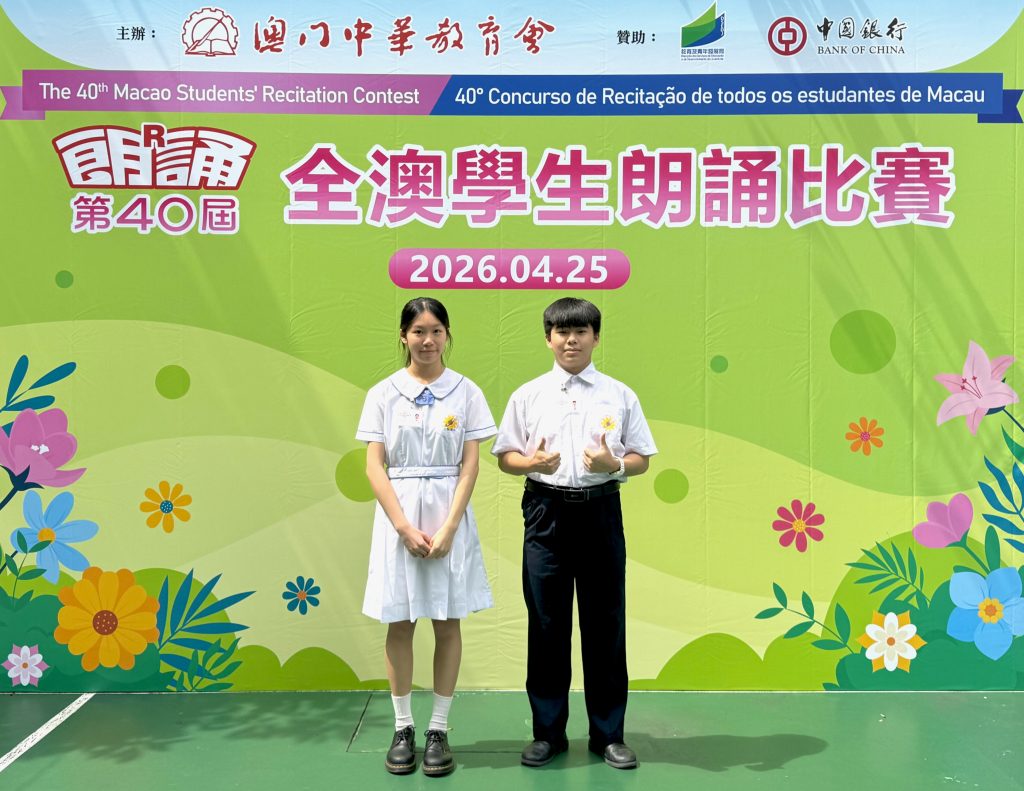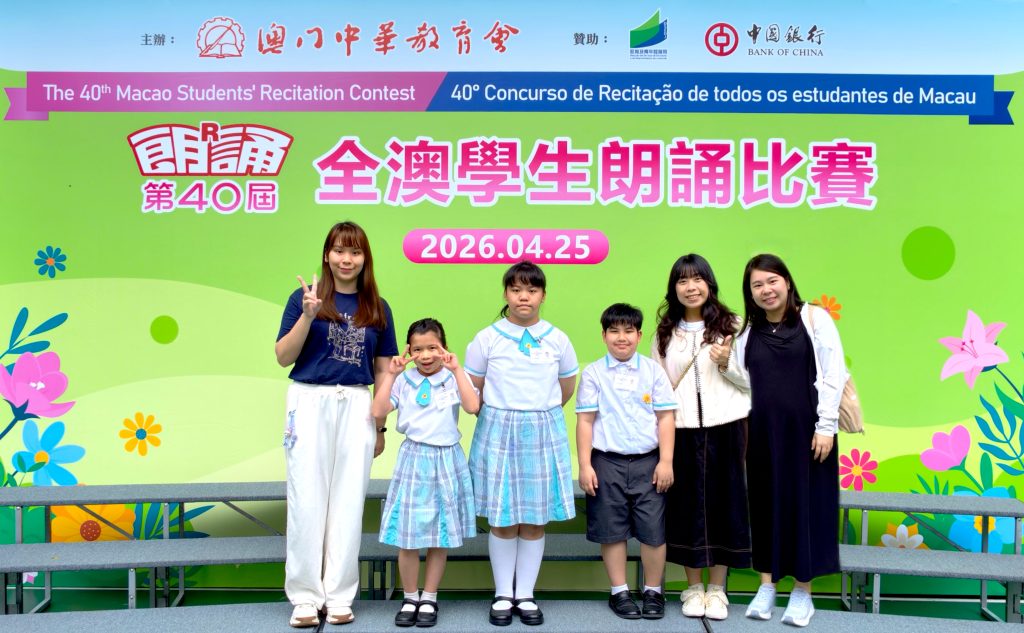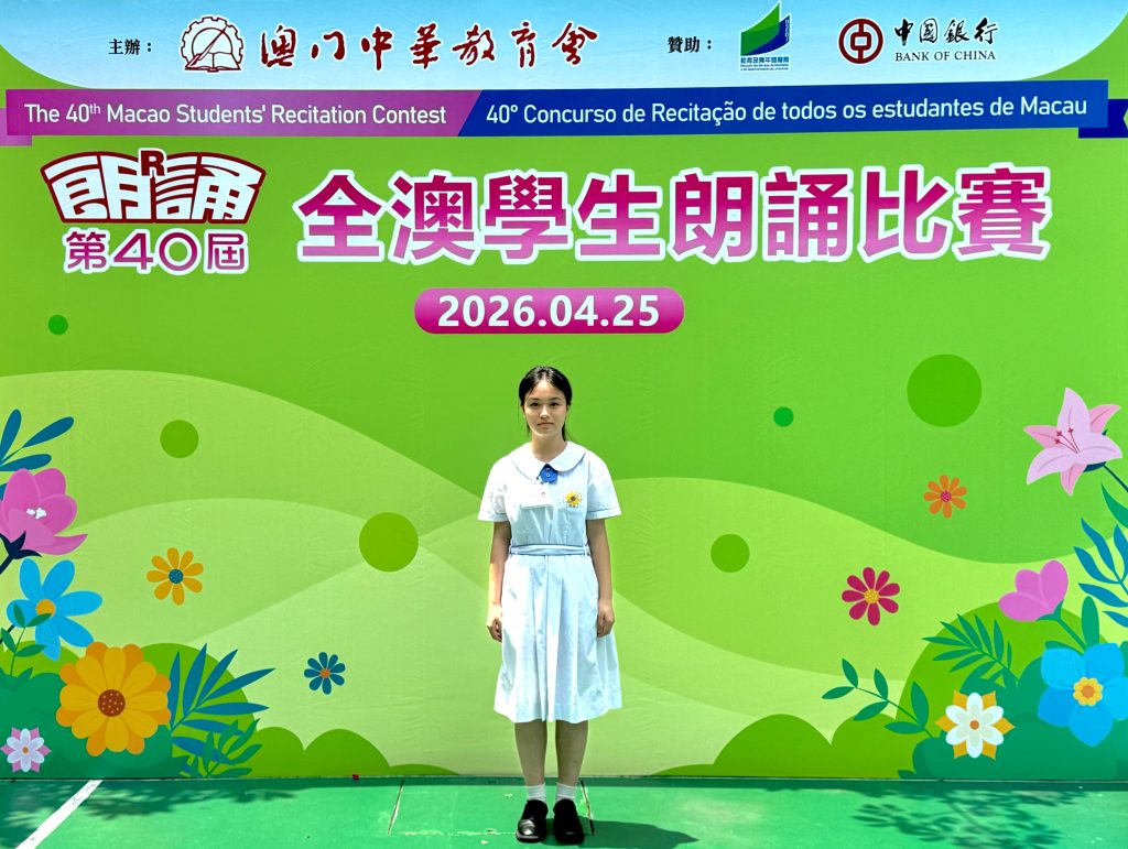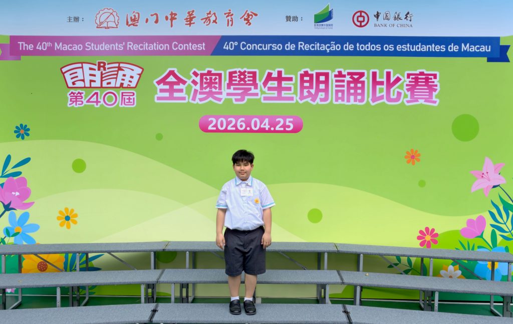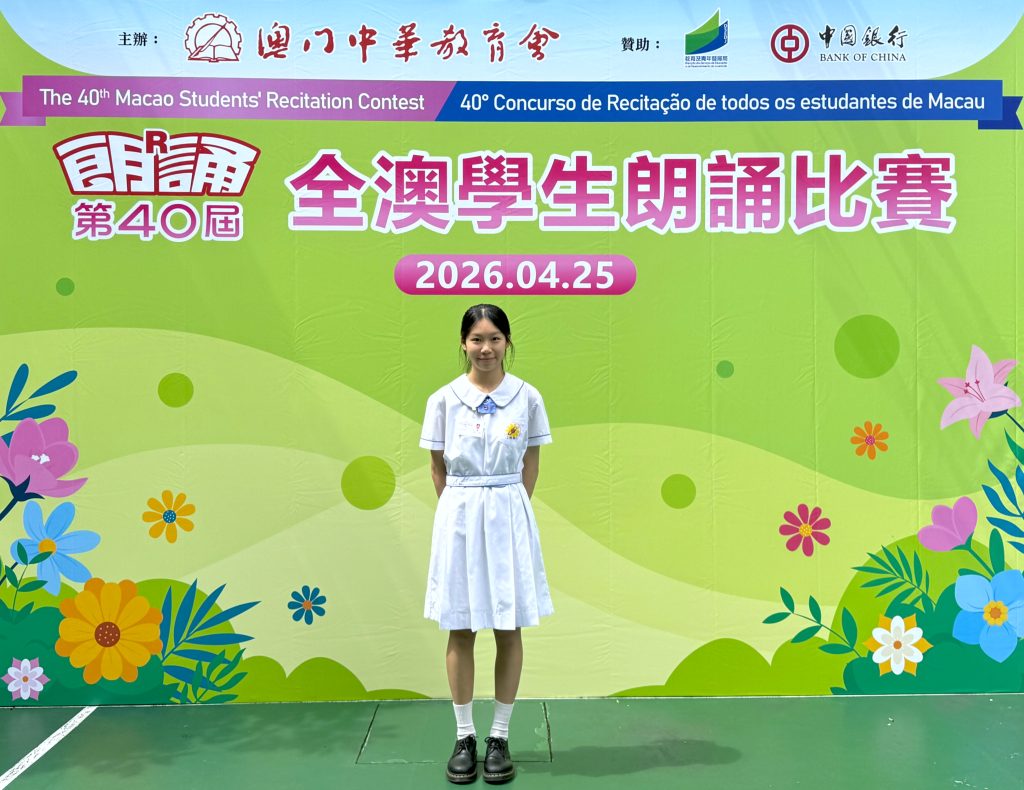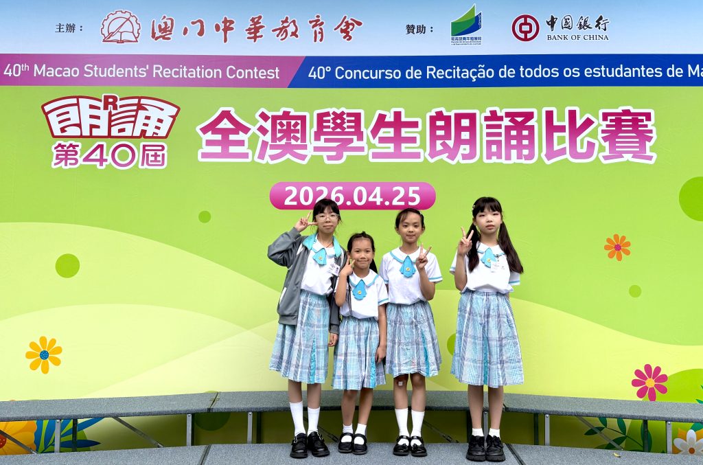 由澳門中華教育會主辦的「第40屆全澳學生朗誦比賽」,已於2026年4月25日(星期六)在濠江中學(正校部)圓滿舉行。本校中小學共12名學生喜獲獎項。