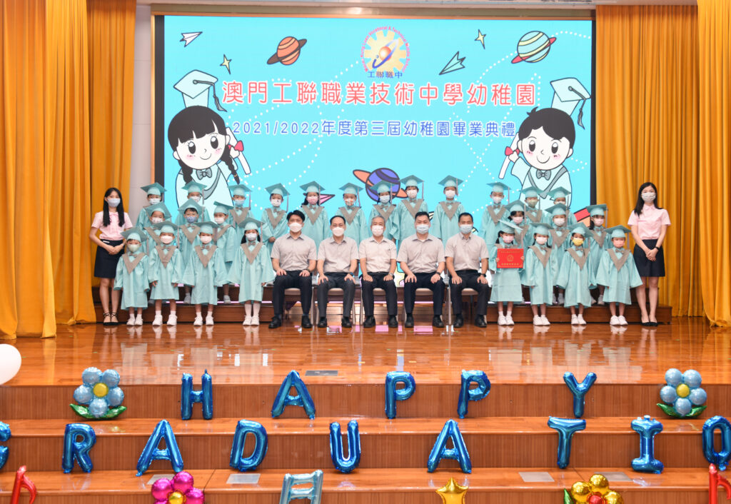 為兼顧落實防疫並讓孩子的階段性學習留下紀念,澳門工聯職業技術中學按照教青局及衛生局的指引,做好各項防疫措施,控制聚集人數。延於九月十七日在學校禮堂分三場次舉辨2021/2022學年第三屆幼稚園畢業典禮,讓家長與畢業生能留下一個珍貴與難忘的畢業回憶。
