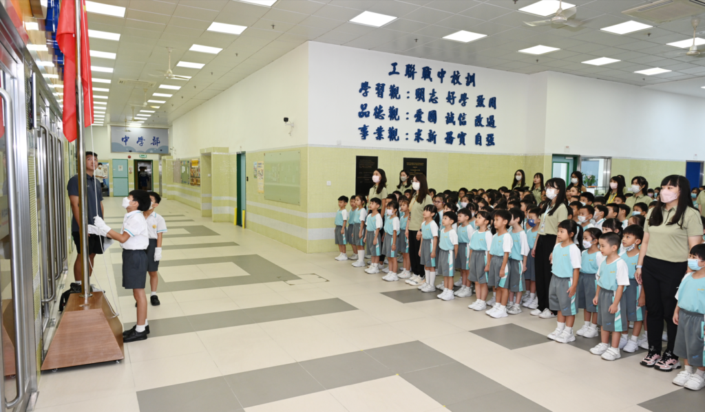 為慶祝中華人民共和國成立74週年,我校小學部全體師生於九月二十九日(星期五)在禮堂門口舉行升旗儀式。師生們肅立注視升旗手步操進場,隨著《義勇軍進行曲》響起,聽著雄壯的國歌聲,國旗在空中冉冉升起,目光所至皆為華夏,五星閃耀皆為信仰,祝願祖國繁榮昌盛,國泰民安。